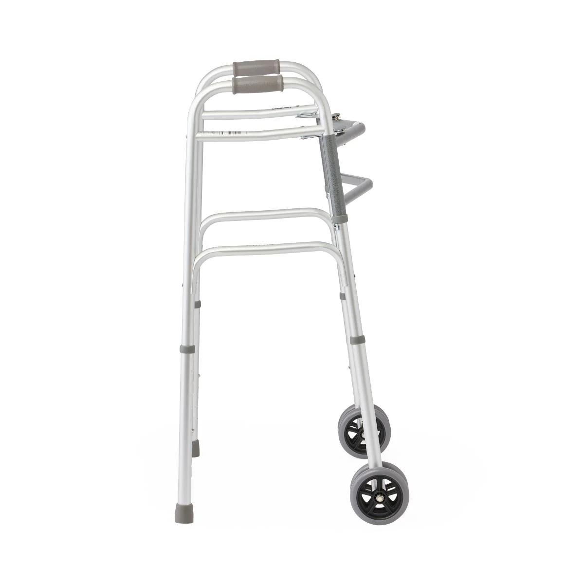 Featuring easy-to-use push-button mechanisms that may be operated by the fingers, palm or side of hand, each side of this lightweight walker operates independently. Enjoy easy movement through narrow spaces and greater stability when standing up, while the front cross braces located near the top of the walker allow full stride. Sturdy 1" aluminum tubing folds to a slim 4 1/2" for easy transportation and storage. Contoured textured, PVC handgrips provide additional patient comfort. Height adjusts from 33.5" to 43 1/2" in one-inch increments. Width inside hand grips: 20 1/2"; width inside base legs: 28"; depth opened at base: 19". 500-lb. weight capacity. Limited lifetime warranty on frame. Six month warranty on handgrips, push buttons, feet, wheels, glide caps, and any other "wearable" parts. Extra-Wide Two-Button Walker With Dual 5" Wheels. 1 Each.