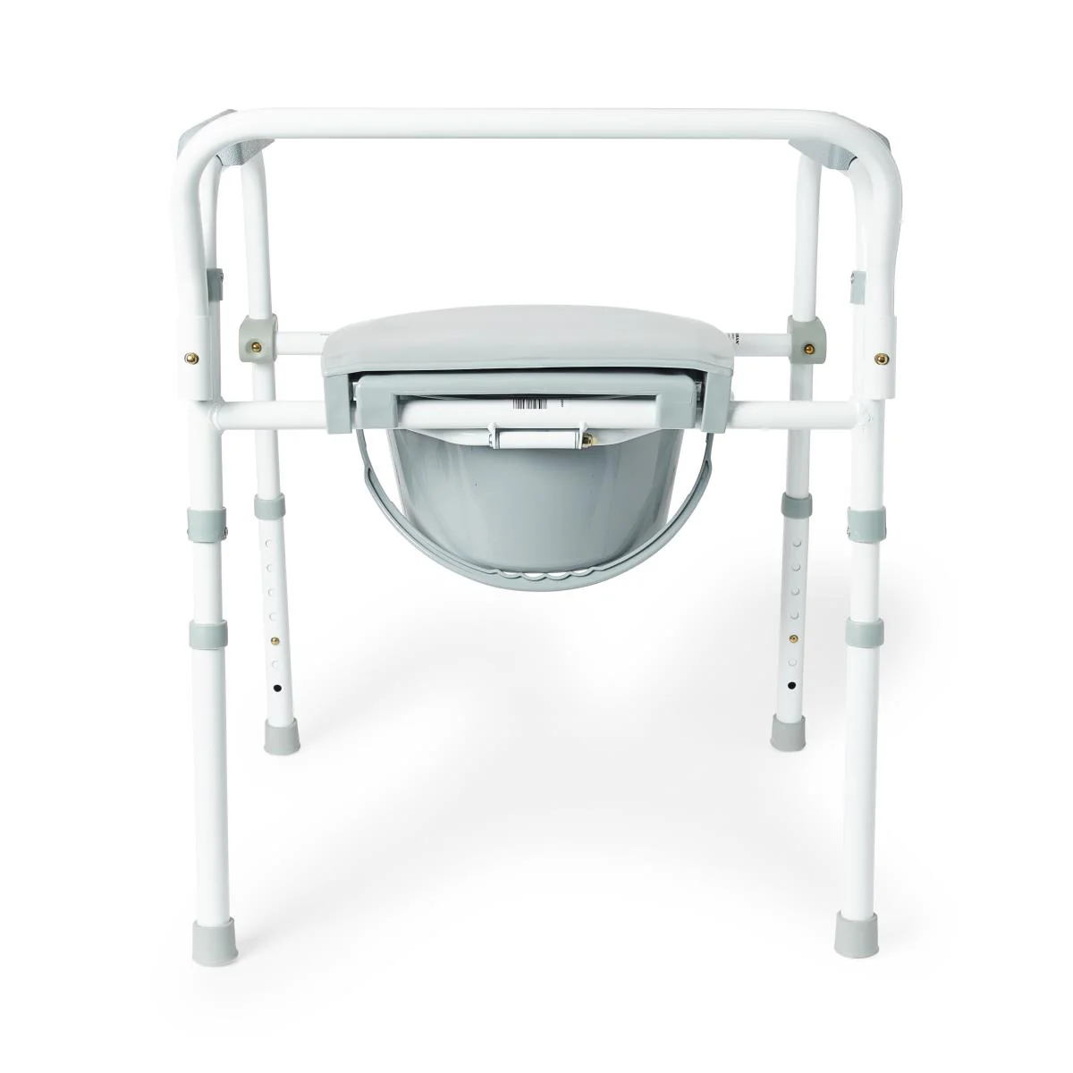 3 IN 1 steel commode painted finish. Folding steel frame assembles in seconds without tools. User can refold for transport or storage. Can be used as a bedside commode or raised toilet seat and safety frame over a standard toilet. Wide base for stability