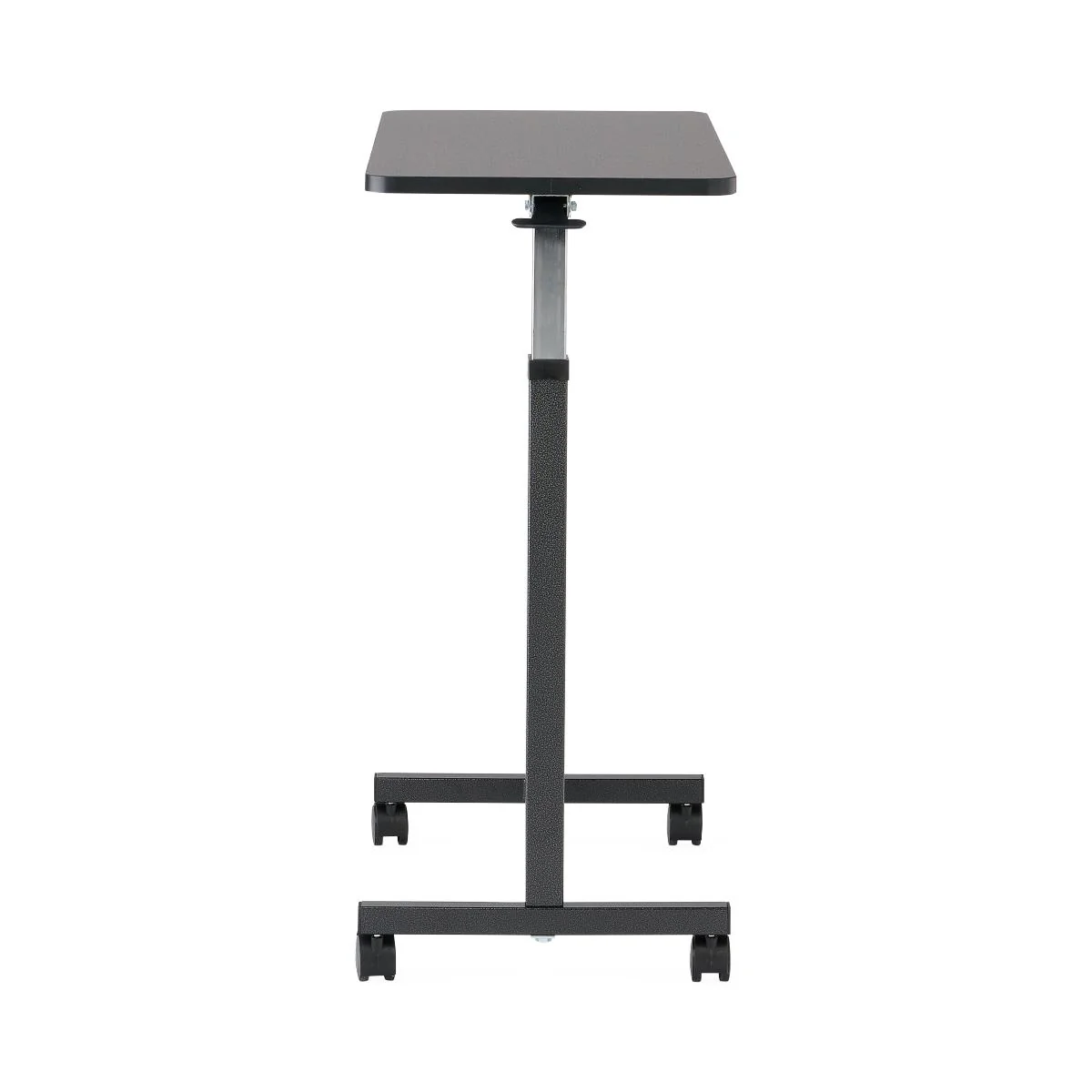 30" x 15" (76 x 38 cm) top with walnut wood grain melamine laminate with a T-mold edge. Automatic spring lift mechanism adjusts height from 28" to 45" (71 to 114 cm). Chrome-plated column and base. Holds up to 50 lbs (23 kgs).