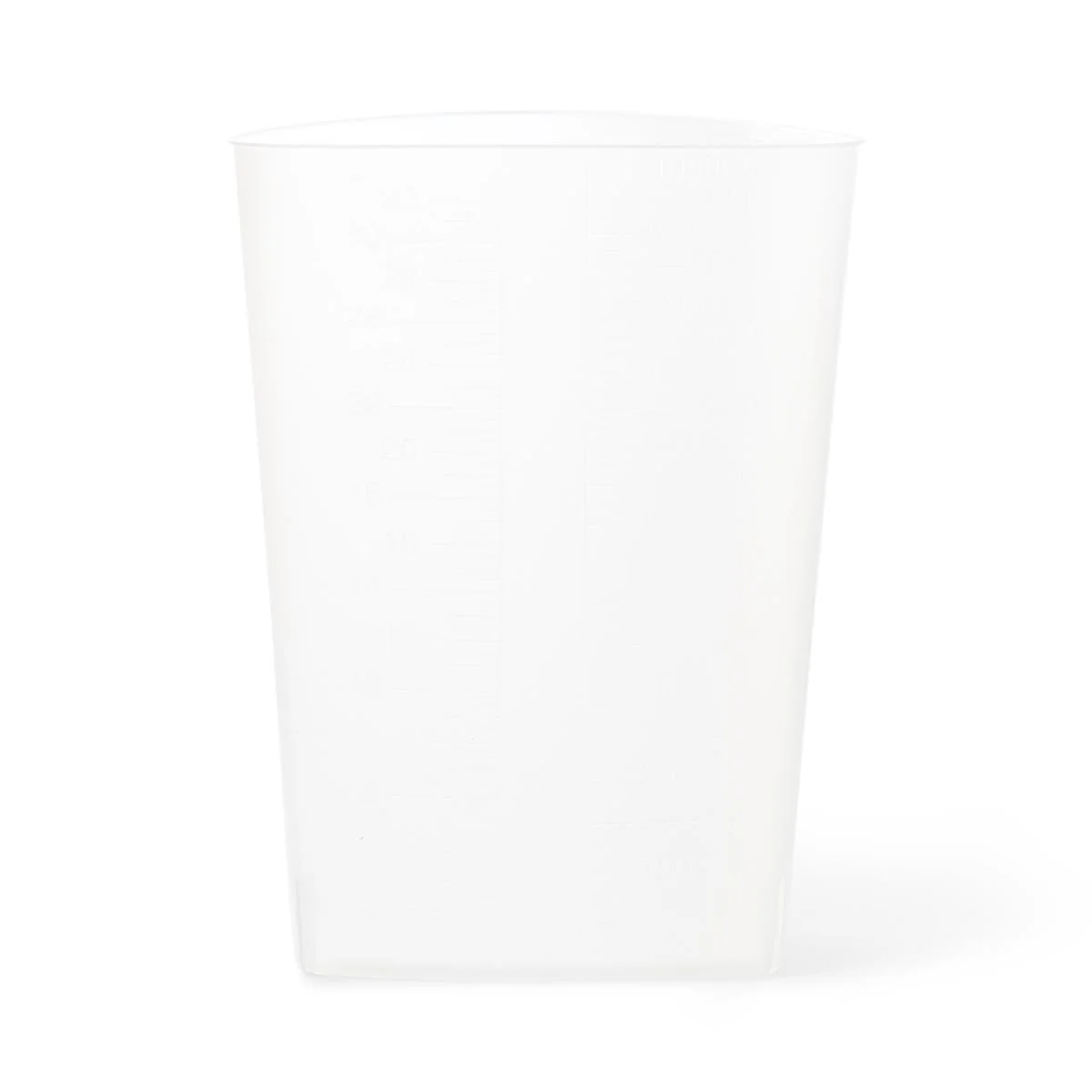 32-oz. plastic triangular container is graduated in mL and ounces for measuring intake or output accurately. Triangular style allows ease of measuring, visualization of contents, and comfortable handling. Features frosted block to include important patient information. Etched Graduations Translucent, Flexible.